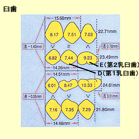 ・最後の難関が10歳頃に生えてくる犬歯です。前歯がきれいでも犬歯の大きさは乳犬歯より大きいため、永久犬歯が生えてきて、D(第1乳臼歯)、E(第2乳臼歯)の乳歯が残っている場合、DやEは次の永久歯の方が小さいので、DやEを少し削って犬歯の生えるスペースを作ってあげる必要があります。